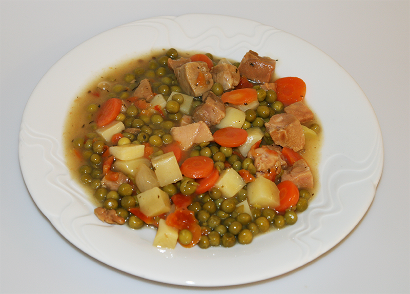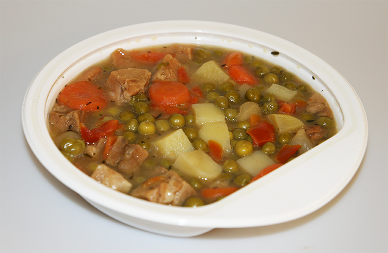 Složení: dušená krůta 25% (krůtí maso, voda, glukóza, sůl, modifikovaný škrob), hrášek 23%, brambory 16%, voda, mrkev 8%, rajčata 6%, cibule 3%, kysaná smetana, bílé víno, citrónová šťáva, řepkový olej, kuřecí bujón (sůl, aroma, kuřecí tuk, kvasničný extrakt, koření, sušená zelenina), sůl, česnek, cukr, pepř, bobkový list. Zahušťovadla: dietní rozpustné vlákniny (guma guar a xanthanová guma).