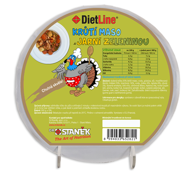 Krůtí maso obsahuje hodně bílkovin a málo tuku. Pochází z přirozeného chovu. Použitá zelenina a hrášek jsou prvotřídní kvality. Nepostrádají křehkost a aroma. Dietline® Krůtí maso s jarní zeleninou se hodí do nízkoenergetického jídelníčku i do jídelníčku, který má pomoci udržovat váhu. Dodává tělu bílkoviny, ochranné a balastní látky a také rostlinný tuk s vysokým podílem nenasycených mastných kyselin.