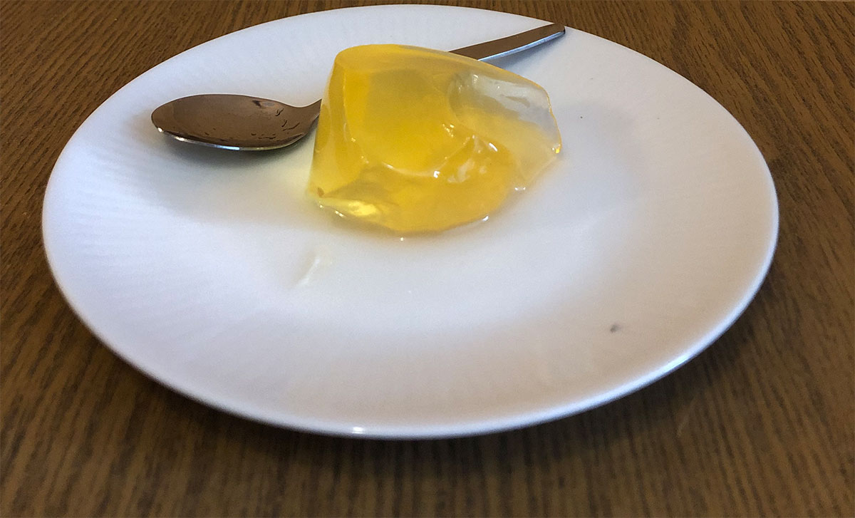 Složení: maltodextrin, želírující látky (karagenan a karubin), okyselující látky (kyselina citrónová a citronan sodný), sladidlo (aspartam), barviva (annato z Bixa orellana L. a kurkumin z Curcuma longa L.).